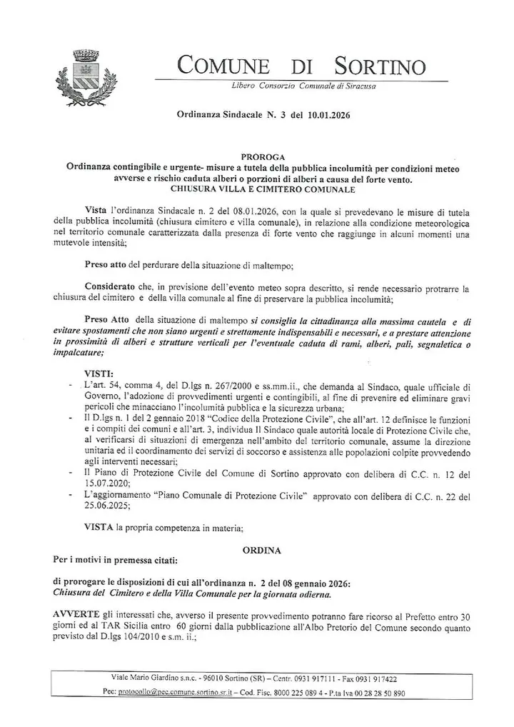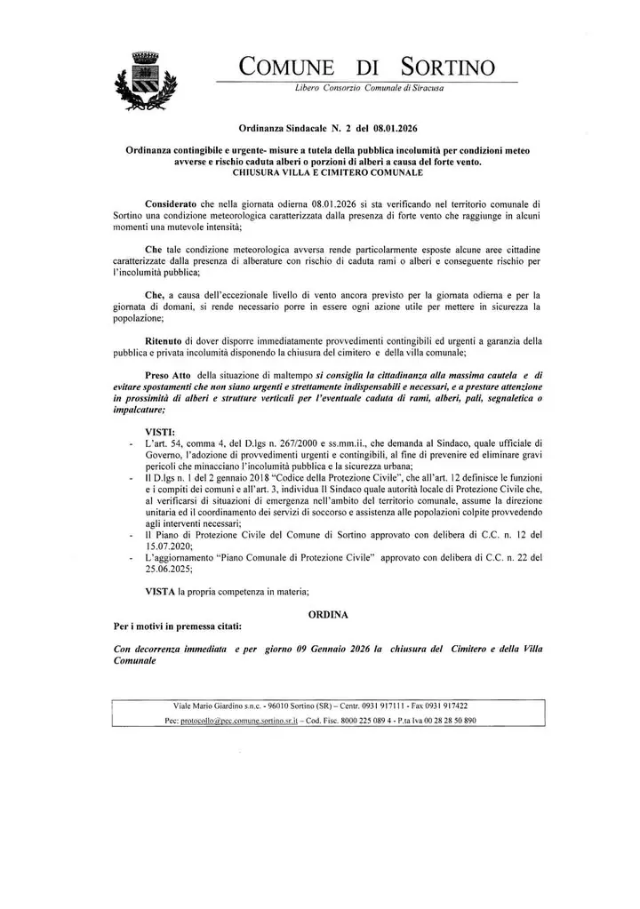 PROROGA CHIUSURA VILLA E CIMITERO COMUNALE Ordinanza contingibile e urgente misure a tutela della pubblica incolumità per condizioni meteo avverse e rischio caduta alberi o porzioni di alberi a causa del forte vento.